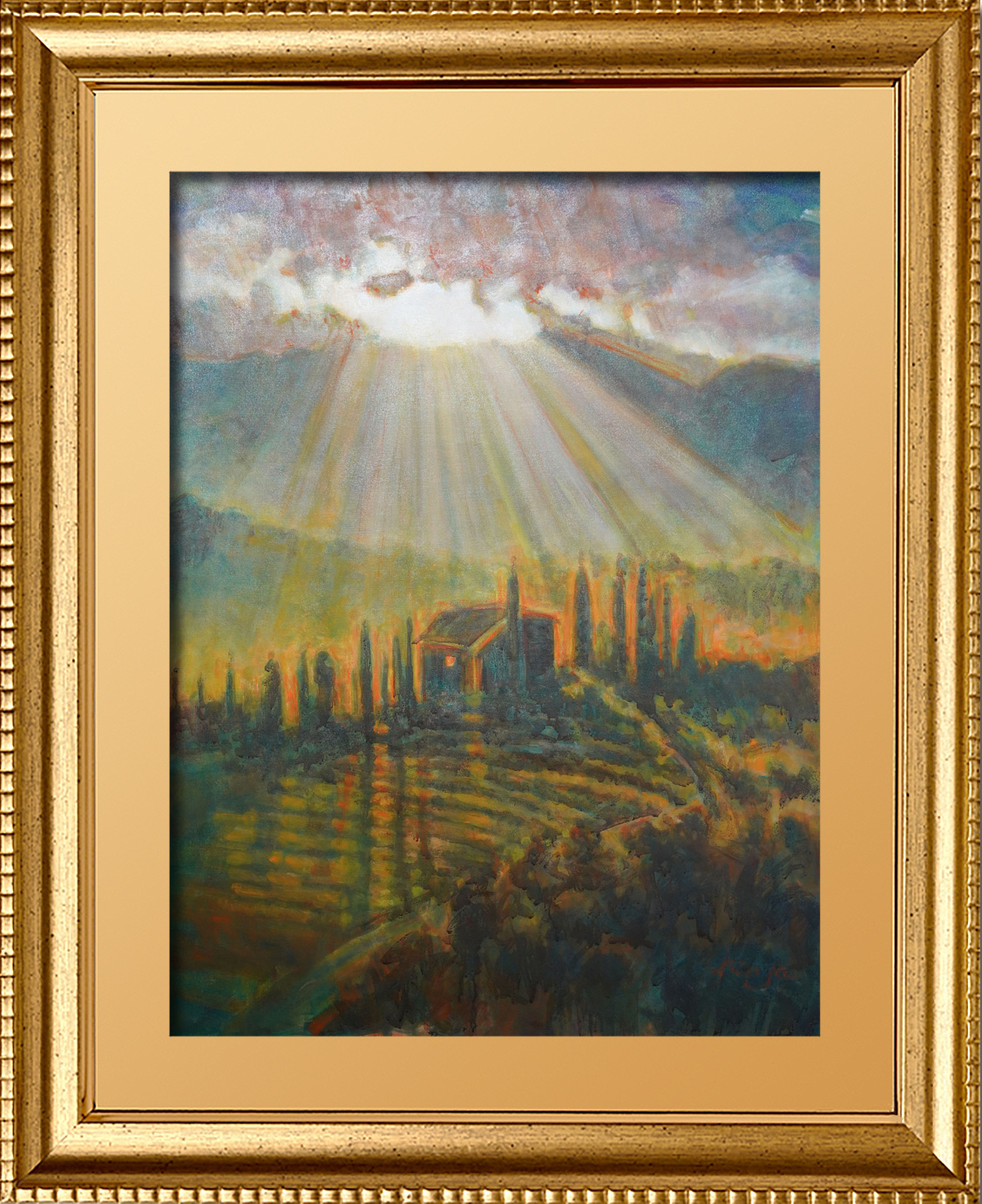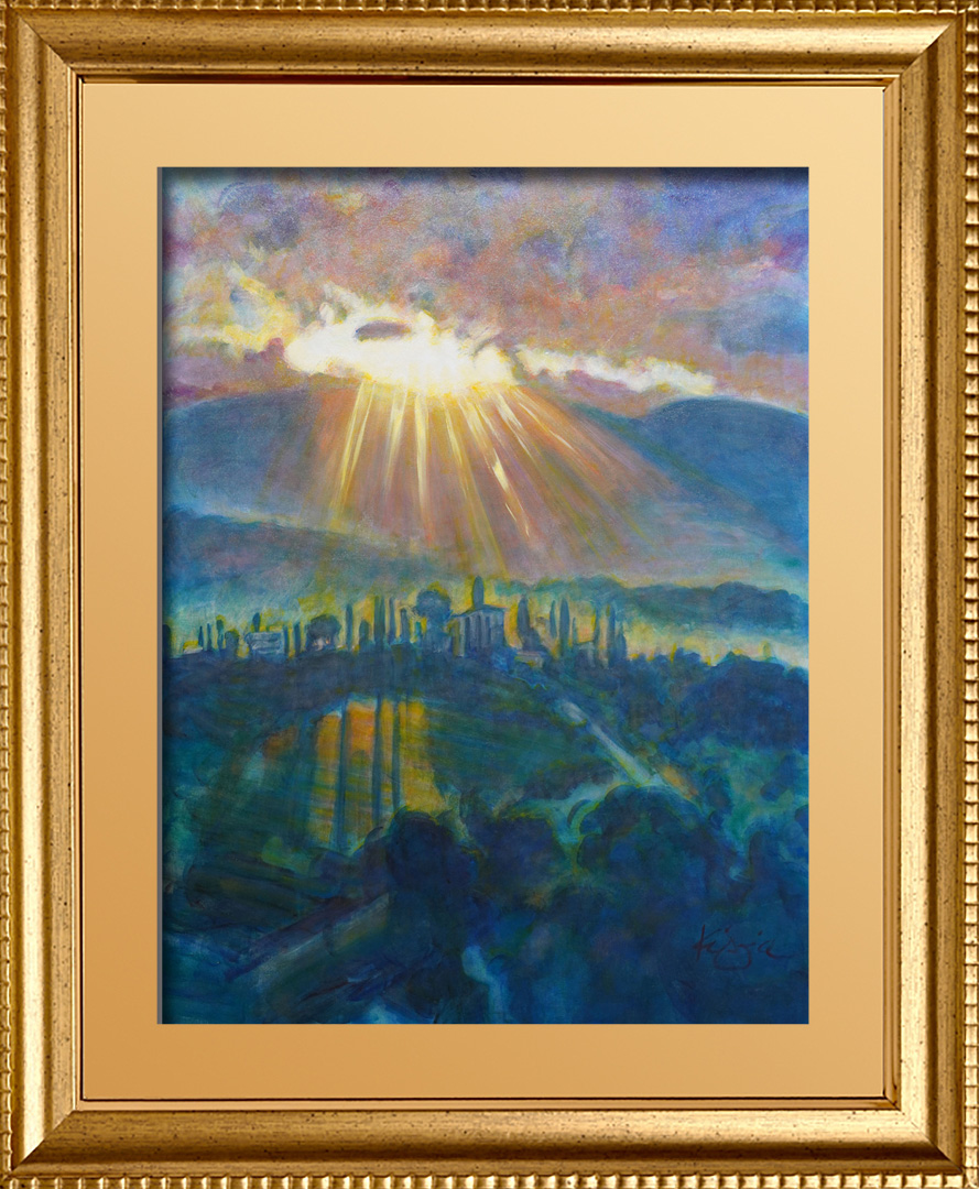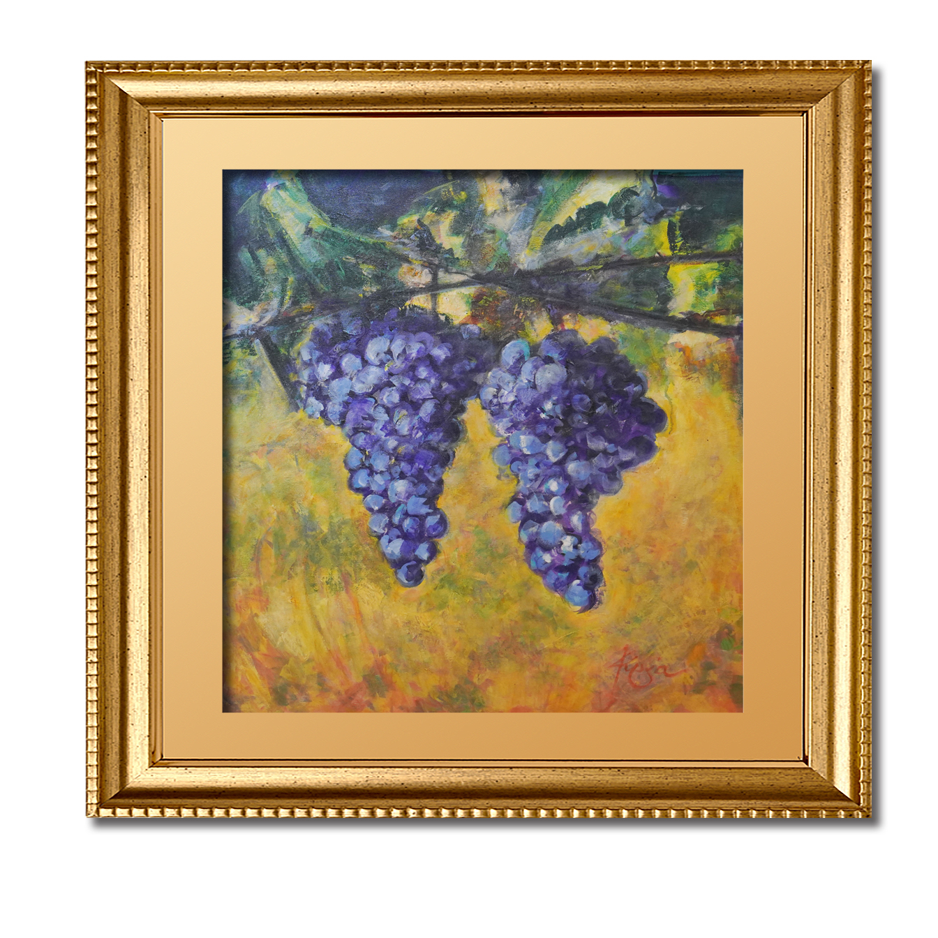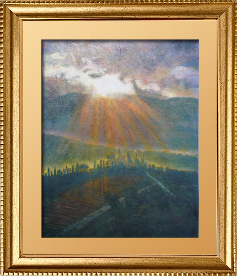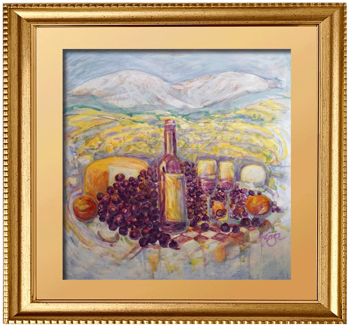 The exquisite “Grapes On The Vine” piece by Master Artist Kip Dodge, is a gorgeous representation of the Tuscany Sun as it dances upon the ripe grapes, ready to be transformed into a fine wine.